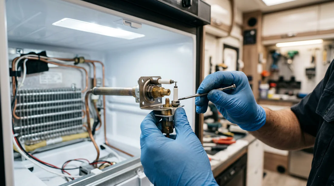 Si le circuit de gaz est propre mais que l'allumage refuse toujours de se déclencher, le problème provient probablement du système d'étincelle. Sur un réfrigérateur Dometic AES (Sélection Automatique d'Énergie) ou manuel, l'étincelle est générée par un allumeur piézoélectrique ou un boîtier électronique. Lors de l'activation, vous devez entendre un cliquetis régulier (le fameux clac-clac). En l'absence de ce bruit, contrôlez l'alimentation électrique de 12 Volts au niveau du bornier arrière de l'appareil. Un fusible de 5 Ampères grillé sur le bloc de commande (souvent de marque Schaudt ou CBE) peut neutraliser l'ensemble du système. Si le cliquetis est présent mais que la flamme ne prend pas, l'électrode d'allumage est peut-être mal positionnée ou oxydée. Elle doit être espacée d'exactement 4 à 5 millimètres du brûleur pour produire un arc électrique optimal. Frottez délicatement la pointe avec du papier de verre à grain fin (grain 400 ou 600) pour restaurer la conductivité. Enfin, vérifiez la masse du câble d'allumage, car une micro-coupure dans la gaine entraîne une déperdition d'énergie et empêche l'étincelle d'atteindre le gaz.